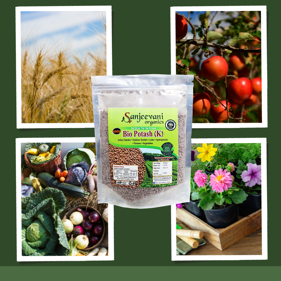 Sanjeevani Organics Bio-Potash is a high-quality organic fertilizer enriched with natural potassium and beneficial microbes. It improves plant strength, enhances flowering and fruit development, and increases resistance to stress and diseases. Ideal for home gardens, nurseries, and agricultural crops, it supports healthy growth while maintaining long-term soil fertility.