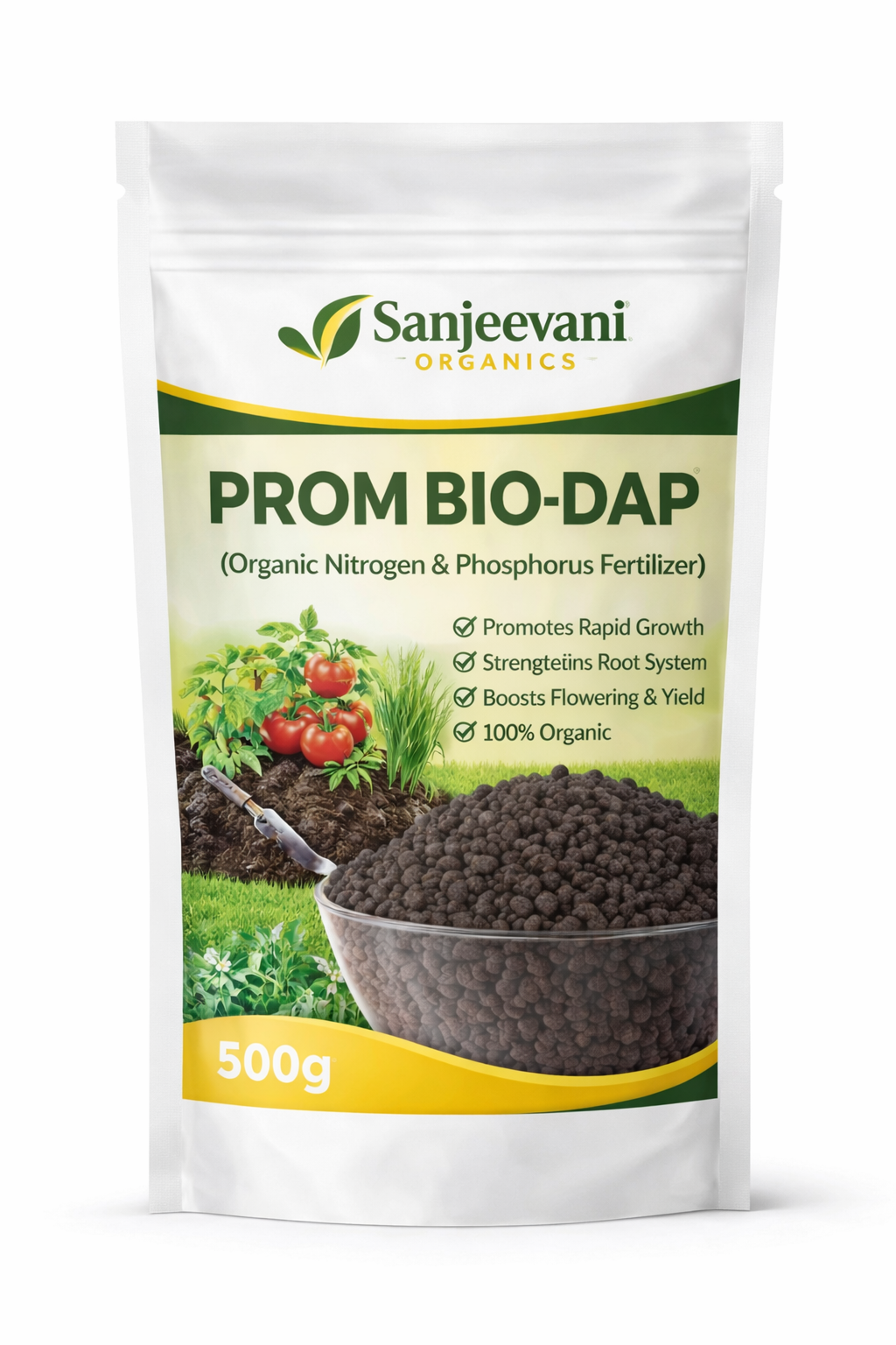 Sanjeevani Organics PROM Bio-DAP is a premium organic alternative to chemical DAP fertilizer, enriched with natural nitrogen, phosphorus, and beneficial microbes. It supports early plant growth, strong root development, and improved nutrient uptake while maintaining long-term soil fertility. Ideal for home gardens, nurseries, and agricultural fields, PROM Bio-DAP helps farmers and gardeners grow healthy crops in a sustainable and eco-friendly way.